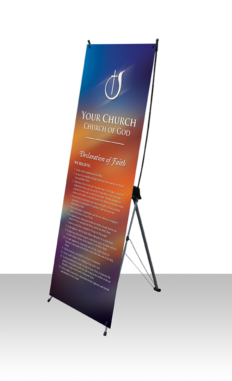 This large vinyl banner features the Declaration of Faith with the Church of God emblem and your church name.