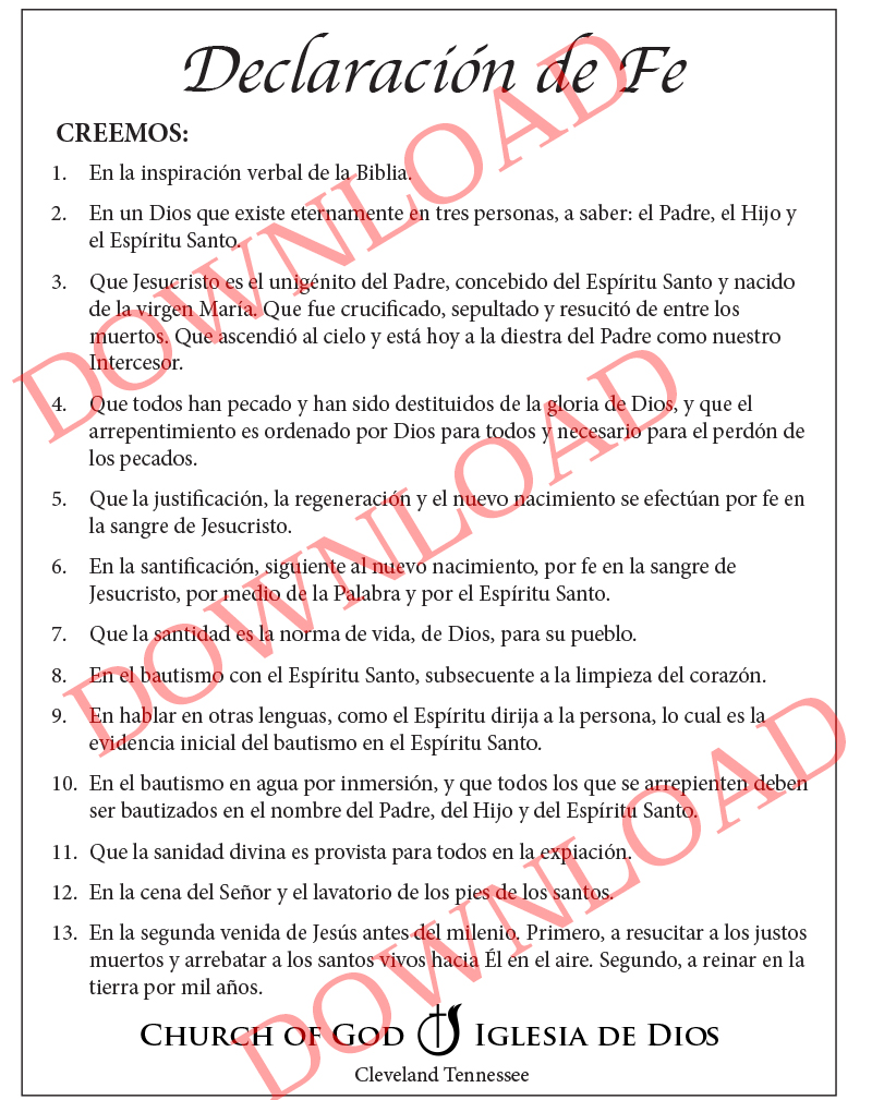 Descargue instantáneamente un PDF de 8.5×11 de la Declaración de Fe de la Iglesia de Dios en español