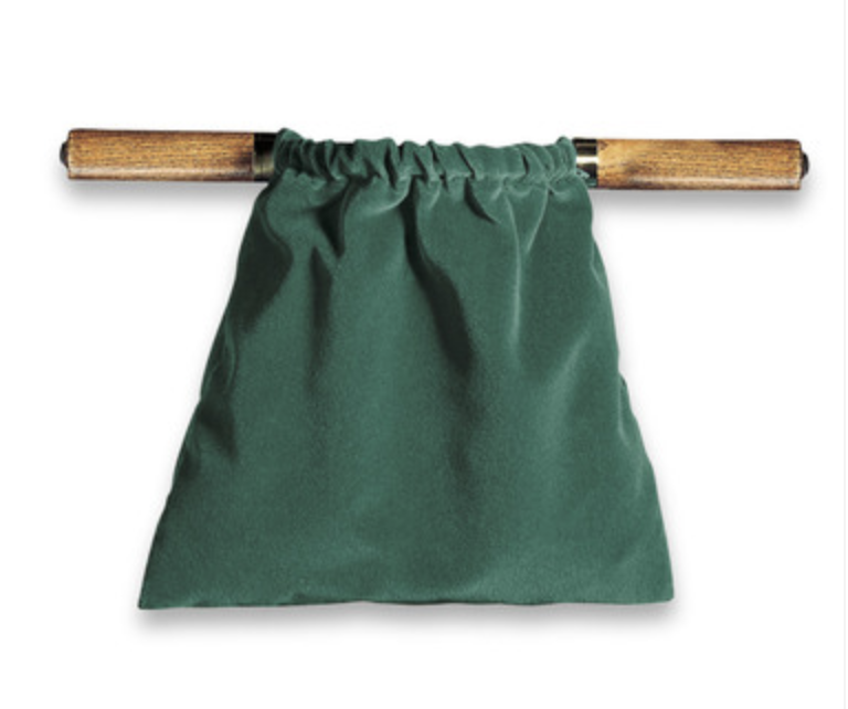 THIS TWO-HANDLED BAG IS ACCENTED WITH SOLID BRASS AND WOOD FINISHED HANDLES.HANDMADE.VELVET BAG.GREEN.OVAL TOP 6 3/4″X5 1/2″.BAG 10″X11 1/4″ ARTISTIC MFG